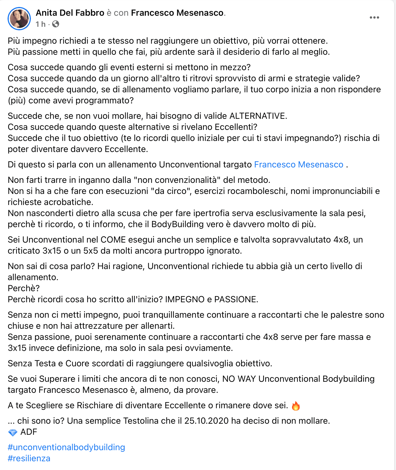 Non fermarti a una tecnica, a una tabella preconfezionata, ma cerca di spaziare con diverse metodiche di allenamento, perché solo quando sarai libero dai vincoli di una gabbia di un qualcosa già scritto potrai davvero ampliare i confini del tuo allenamento e allenarti con reale cognizione di causa.